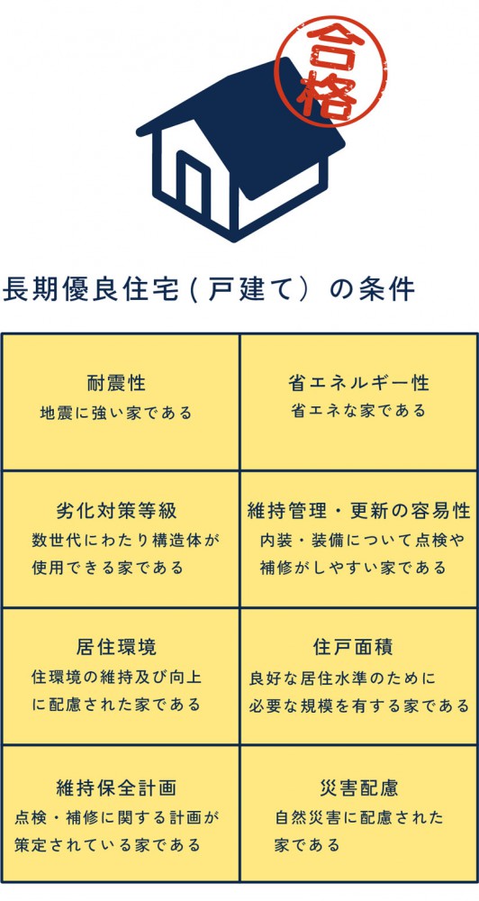 長期優良住宅は、長期にわたり良好な状態で使用するための措置講じられた優良な住宅です。 長期優良住宅の建築及び維持保全の計画を作成し、所管行政庁に申請することで認定を受けることができます。戸建ては大きく分けて以下のような措置が講じられている住宅を指します。