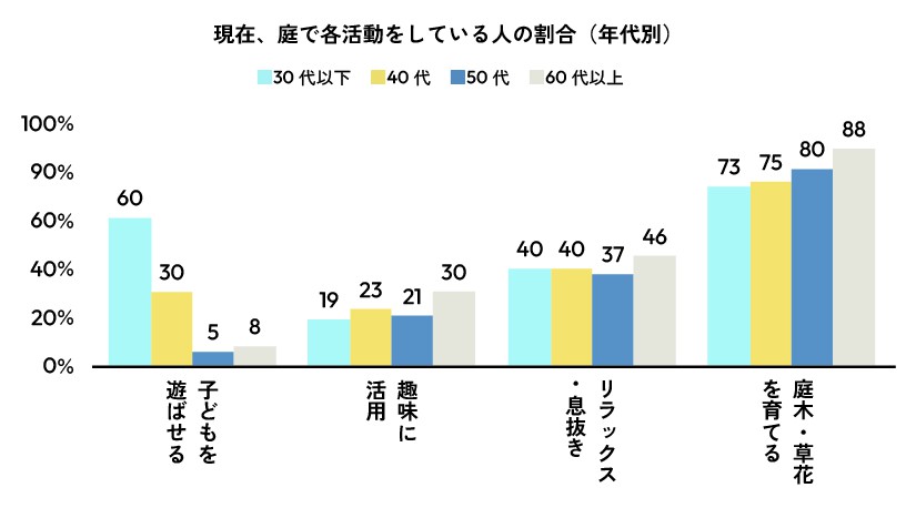 40代、50代になると「趣味に活用」「庭木・草花を育てる」「リラックス・息抜き」が増加。60代以上になるとその割合はさらに増加。お庭は幅広い年齢に、さまざまなメリットがあることが分かります。