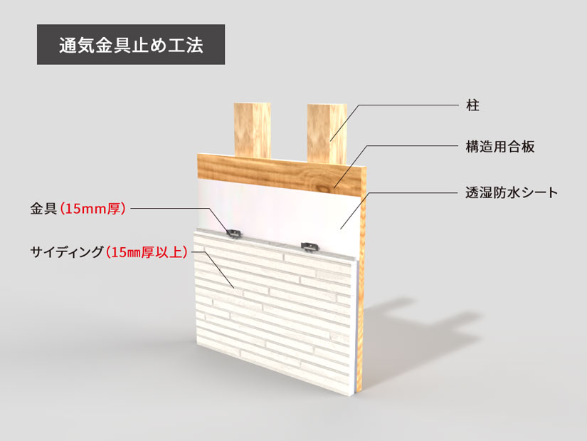 木の胴縁がなく通気が確実に取れること、そして地震に対する対応力が良いという理由から、「通気金具工法」は優れています。