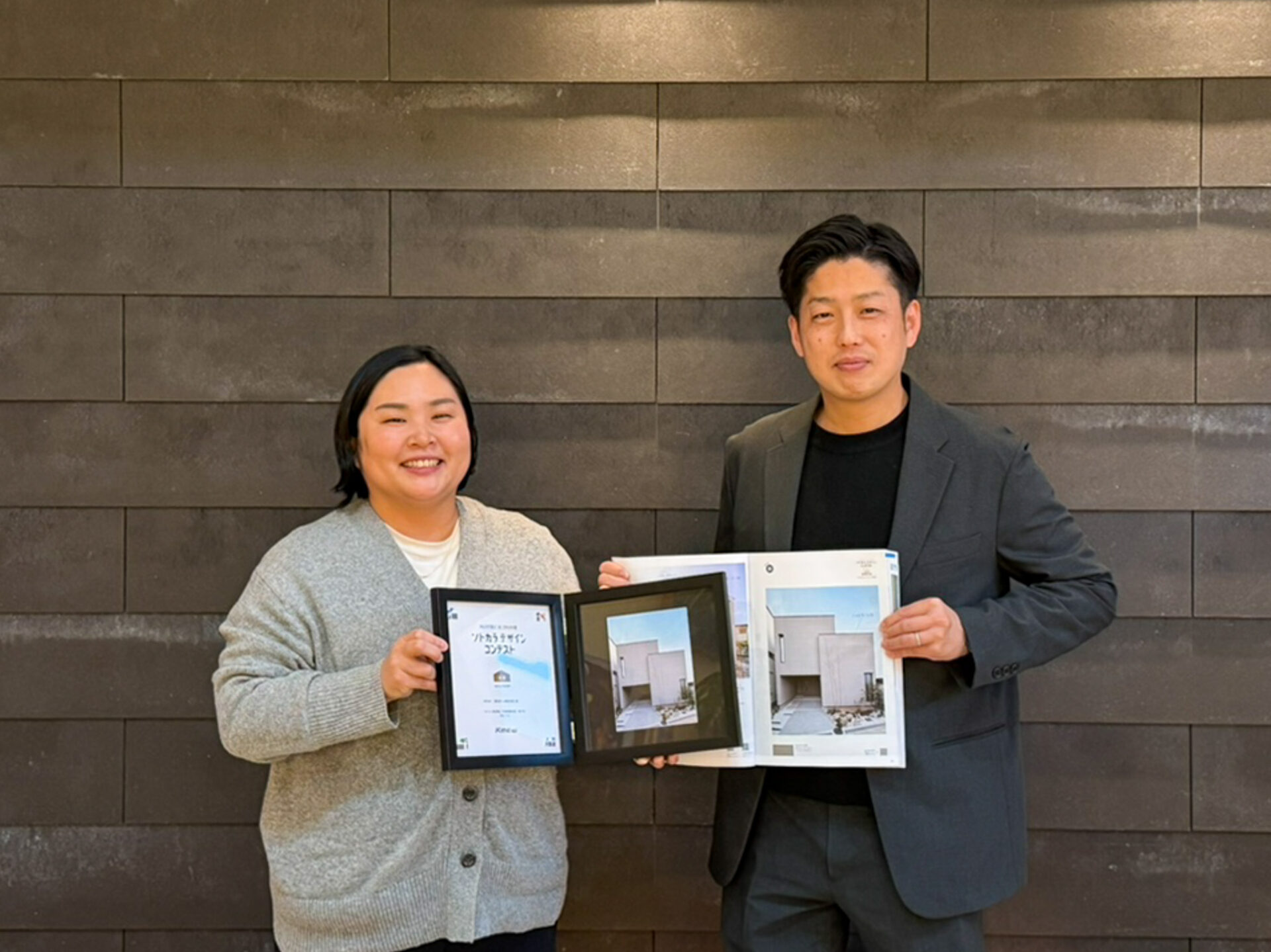 受賞を記念して届いた盾と、KMEWカタログで一面掲載されたページを開いて、社内で写真撮影を行いました。写真に写っているのは、今回の住まいづくりに携わった設計担当とインテリアコーディネート担当です。