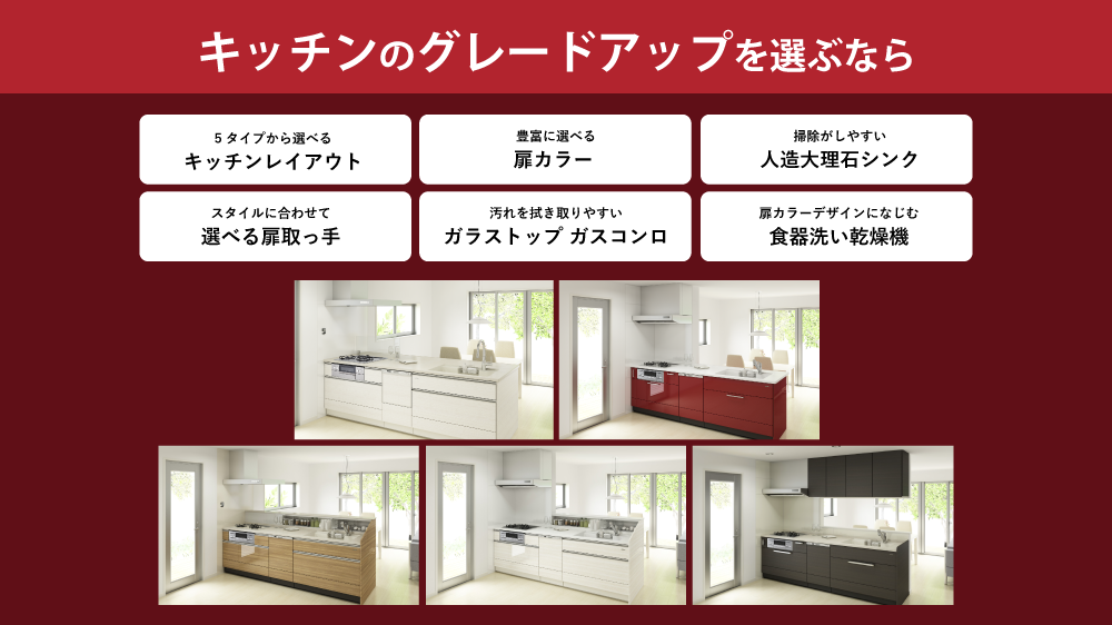 料理の効率、収納力、デザイン。すべてにおいて満足度を高めるワンランク上の最新キッチン本体を無料で採用できます。5タイプのレイアウト、豊富な扉カラー、人造大理石シンク、ガラストップコンロ、食洗器など、妥協のない高性能を追求したい方へ。