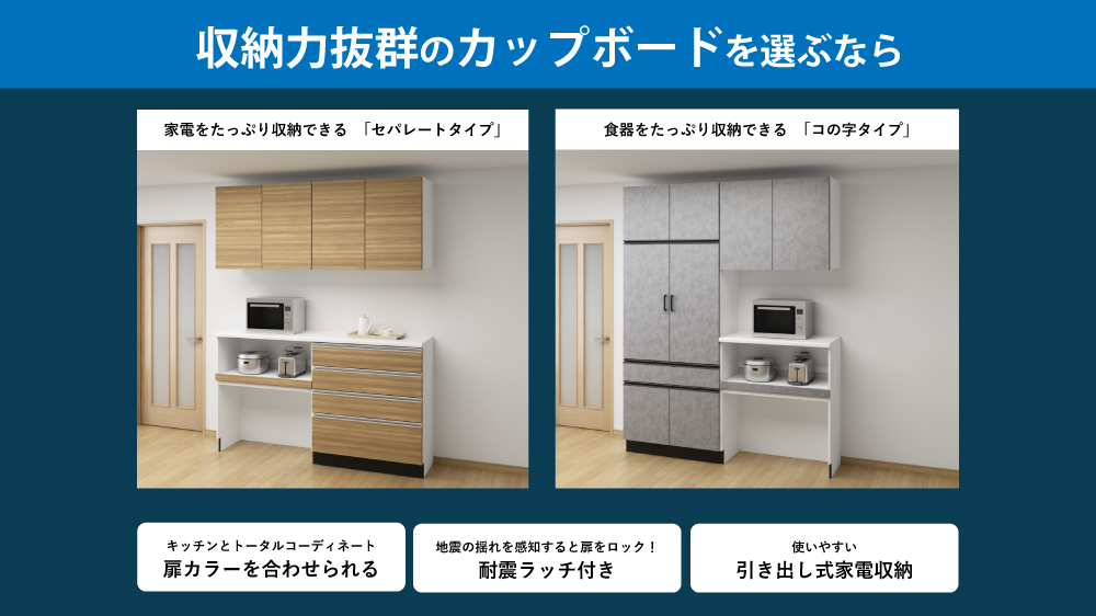 キッチン周りのごちゃつきをなくし、美しいLDKを完成させたい方へ。キッチン本体とカラーを合わせた大容量カップボードを無料でお取り付けします。地震に強い耐震ラッチや便利な引き出し式家電収納も標準装備。収納力と美しさを最優先したい方へ