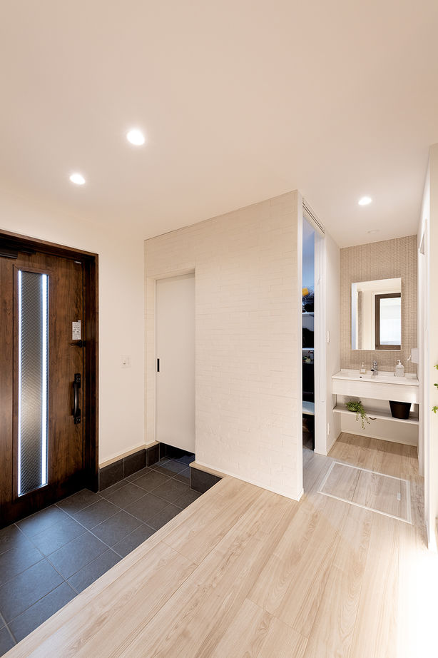 アッシュな雰囲気のフローリング、テラスに面した大開口、天井を彩る間接照明…。高級ホテルのスイートを思わせるLDKは、こだわりがたっぷりと詰まった上品なシンプルモダンの住まいです。階段の途中にはリビングと一体感のあるスキップフロアを設計。隣接する和室は灰桜色のタタミをセレクトしてデザインに統一感を持たせ、ダイニングサイドの壁には立体感のあるエコカラットのアクセントウォールを採用。「くつろげる上にずっと眺めていても飽きが来ない空間」に仕上げられています。「泉北ホームさんの家づくりは自由度が高くてやりたいことをしっかりと検討して盛り込むことができました。クオーツストーン天板の高級輸入キッチンも標準仕様で選べたことが嬉しかったです」とE様。「大空間の家なのに真冬も床暖房だけで快適です」と性能の良さも実感。ダブル発電(太陽光発電+エネファーム)のZEH住宅は「驚くほど経済的」とE様の満足度は高かったご様子でした。