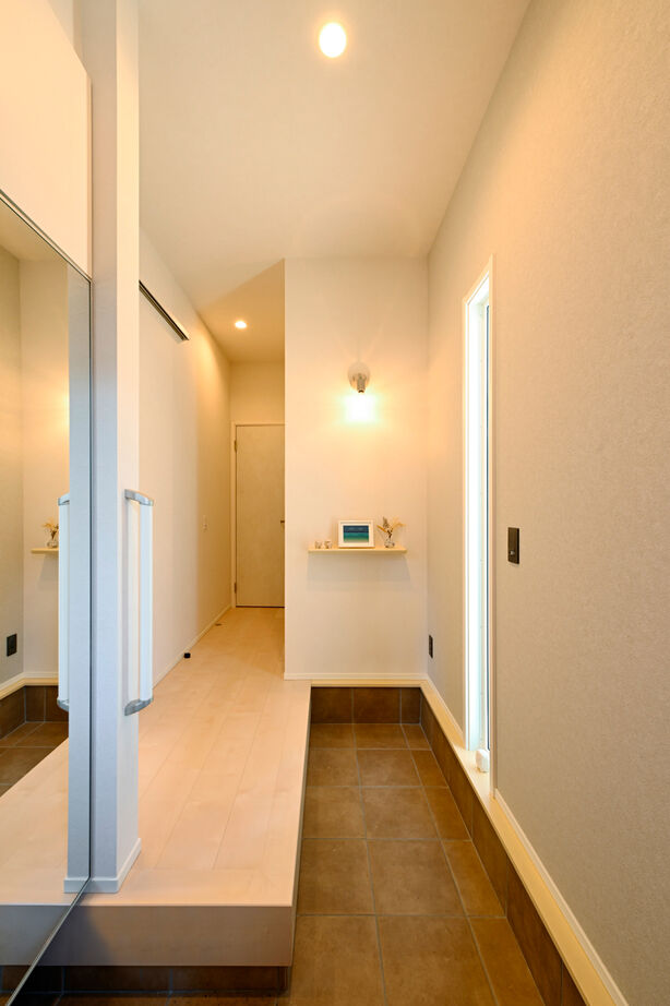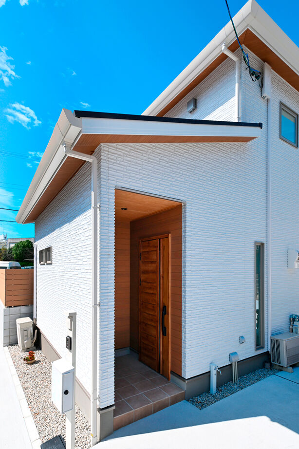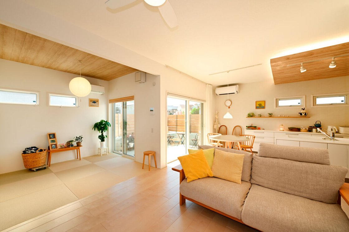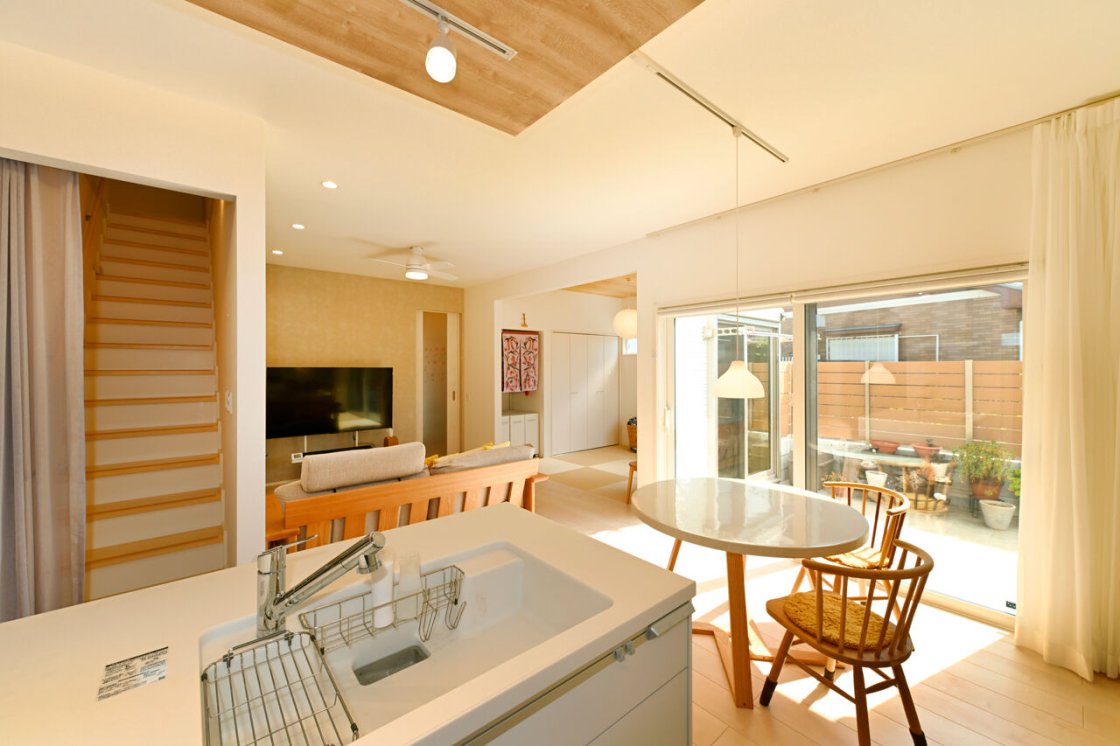 祖母様から譲り受けた土地で家づくりをスタートしたN様。展示場で泉北ホームと出会い、耐震性の高さ、豊富な設備、性能面を予算内で叶えられる点が決め手に。1階は庭を計画し、庭に面した大きな窓から光が注ぐ、心地よい明るさのLDKを実現。以前の祖母様宅の日本家屋を意識して和室を設け、リビングと一体的に使えるよう工夫し、ここからも庭の景観を楽しめます。天井高は2.7mを確保し、キッチンは吊り収納を設けず開放感を最優先。白と明るい木目調の組み合わせで、理想の北欧テイストを叶えました。
