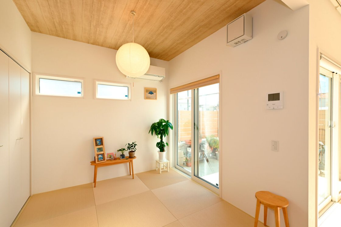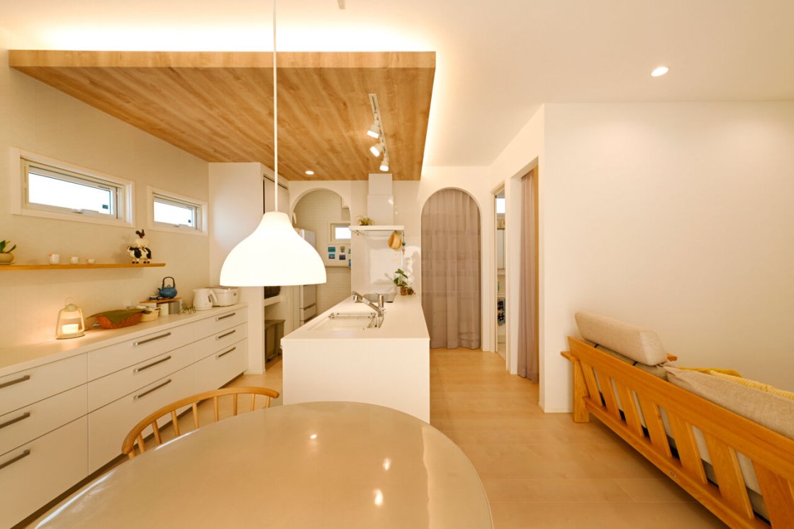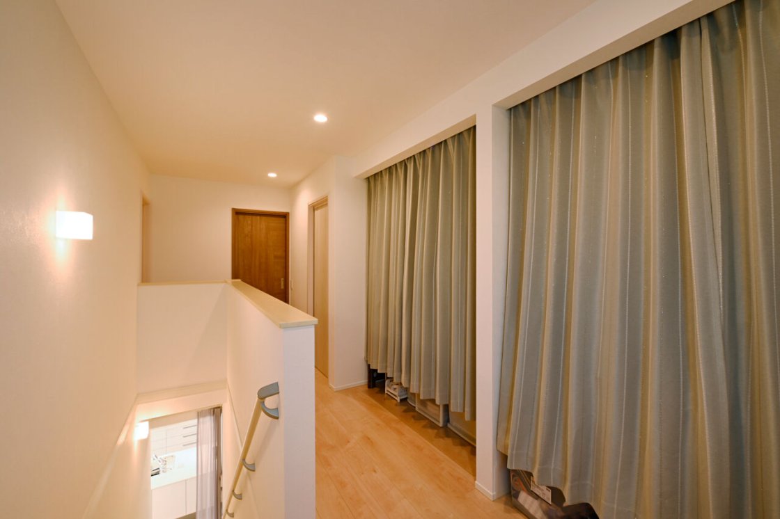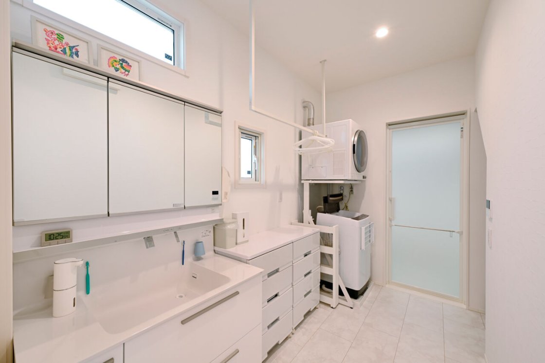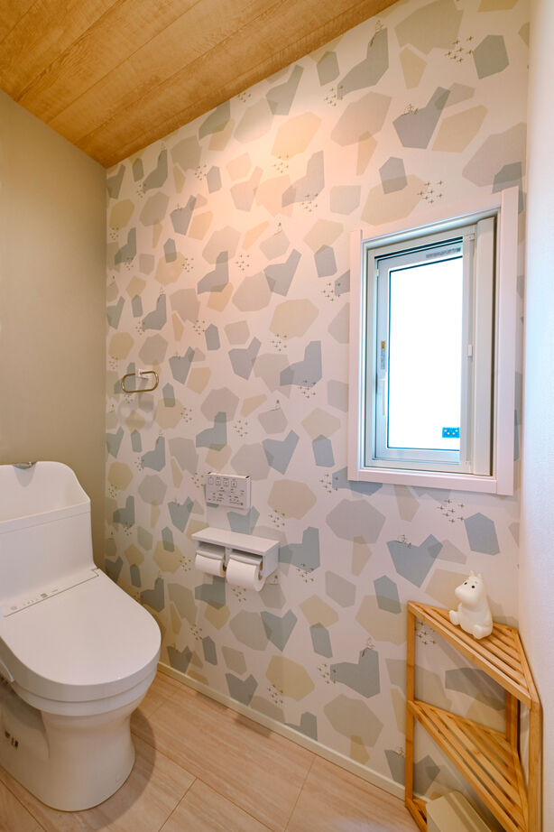 キッチン横のパントリーは回遊できる配置にし、冷蔵庫もすっきり納まる動線計画。洗面脱衣室は室内干しに対応する広さを確保し、階段下収納もタオルや洗剤のストックに活用。2階は廊下に面したクローゼットを設け、洗面脱衣室隣の階段から上がってすぐ片付けられるように。トイレは淡い色合いにムーミン柄クロスを採用し、遊び心のある空間に。「家事動線がよく、エアコンの効きもいいので快適。好きな雑貨や観葉植物を育てています」とN様。